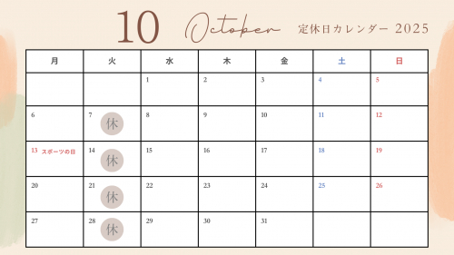10月の休業日をお知らせいたします。